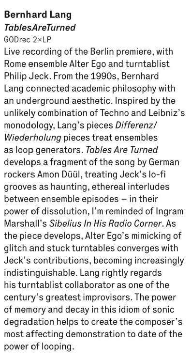 TablesAreTurned is the first collaboration between one of the most significant austrian composers of today, Bernhard Lang, and prominent english turntablist Philip Jeck.