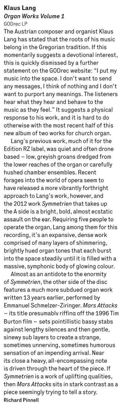 Lang’s image is largely marked through his output for stage and his favourite instrument – organ, exploring entire spectrum of possible sounds, from hum to sine waves, therefore starts GODrec a series of releases with his organ music with two different aesthetic examples mentioned above.